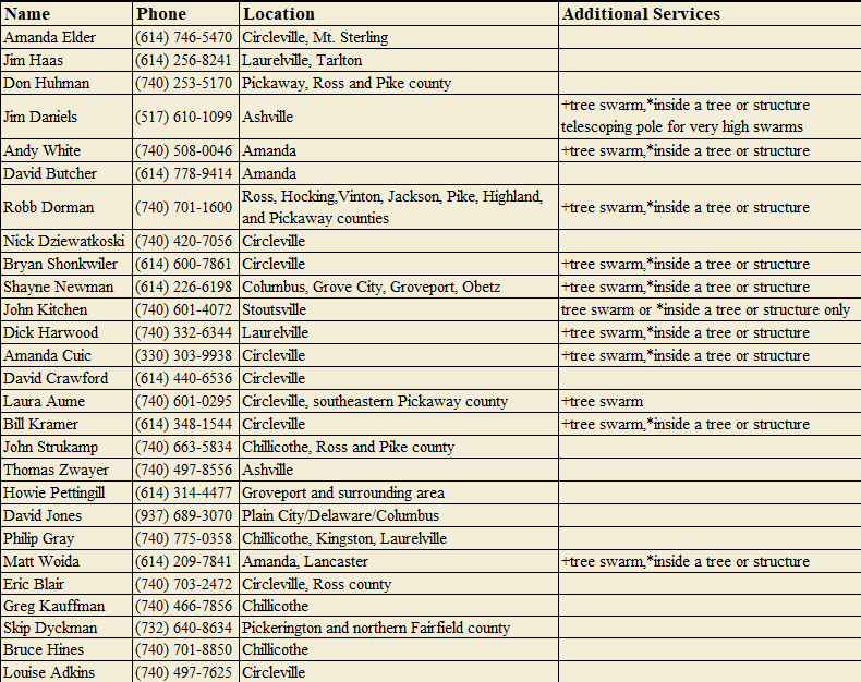 The following beekeepers may be available to remove an easily accessible honey bee swarm like those pictured above from your property. Some beekeepers offer the additional services listed. If one person doesn't answer or is not available, please try another person on the list until you find someone.